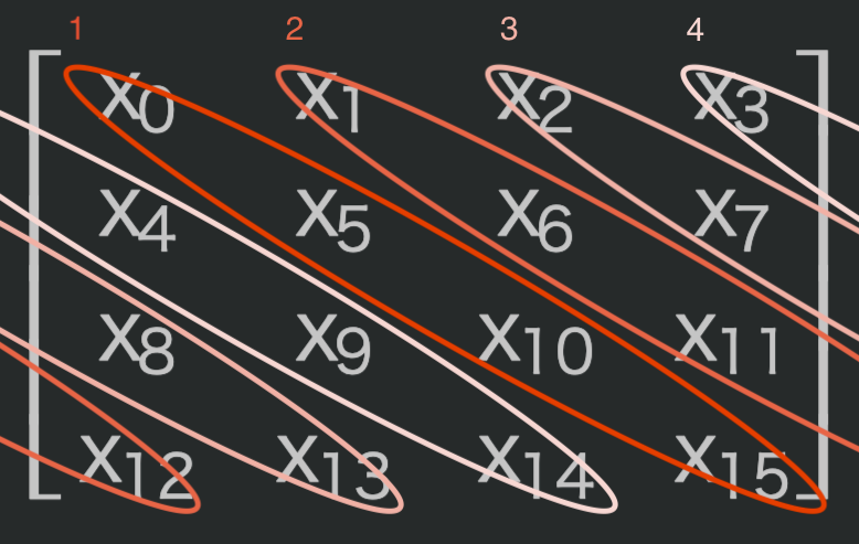 diagonal 方向はこんな感じ。おなじく全部処理したら1ラウンドなのは同じだけど、ななめ方向にかきまわすのが column round との違い